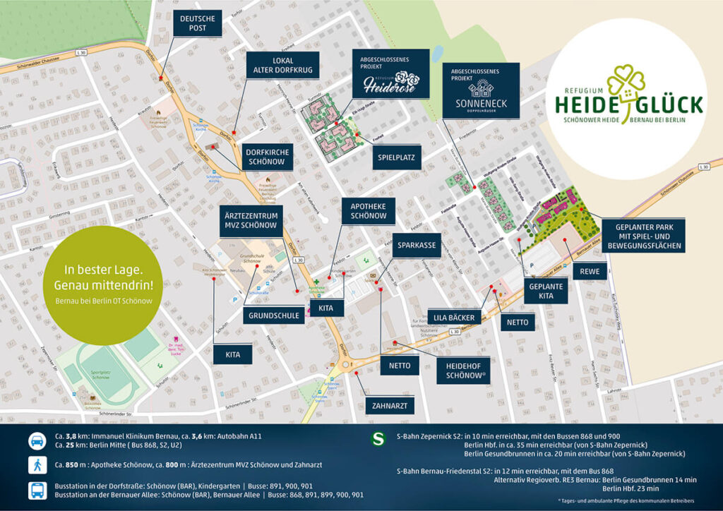 - S-Bahn Zepernick S2: reachable with buses 868 and 900 in 10 min. From there, with S2, to Berlin Hbf. approx. 35 min, to Berlin Gesundbrunnen approx. 20 min