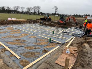 House 1 | Sanitary and heating installation, screed completed, facade in progress
